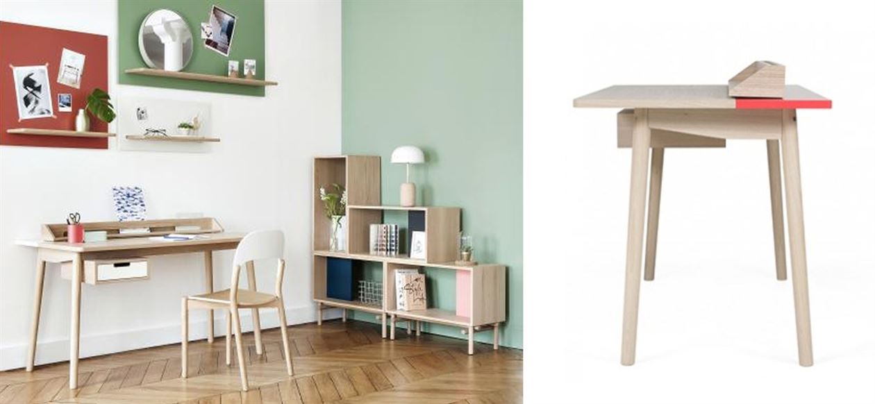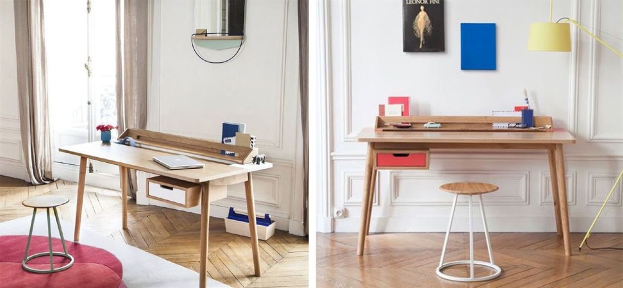 Pierre-François wanted to create a functional, comfortable and discrete workspace: wires are hidden in a specific box which is visible when the piece on the top of the desk is pushed with the hand.