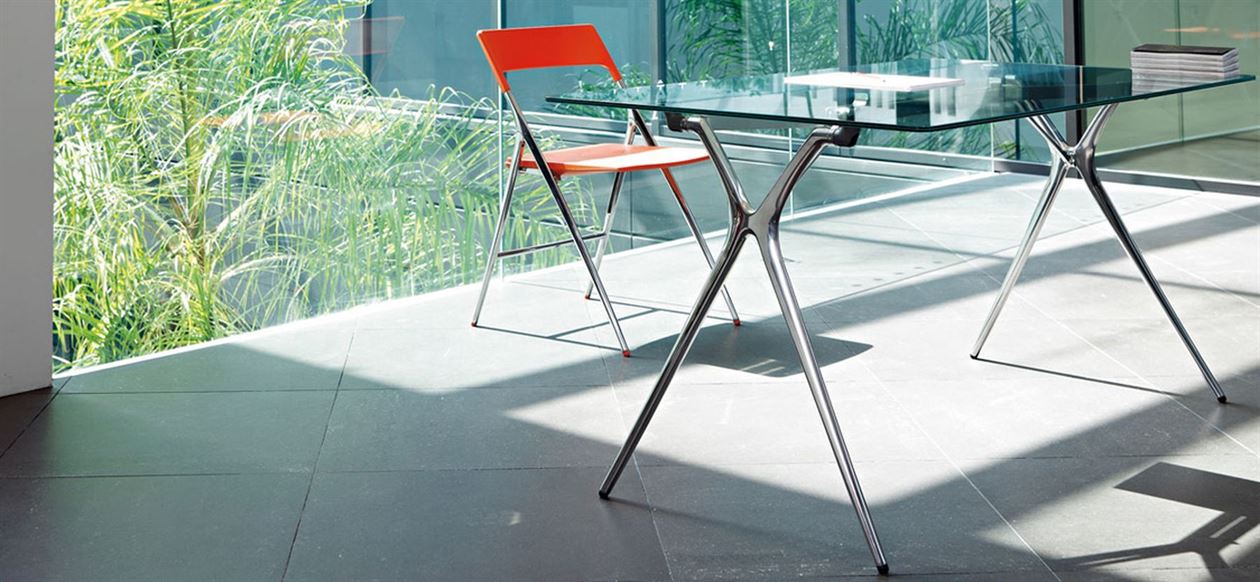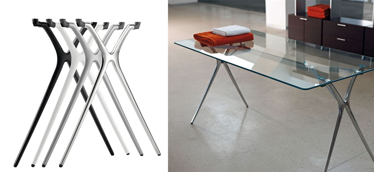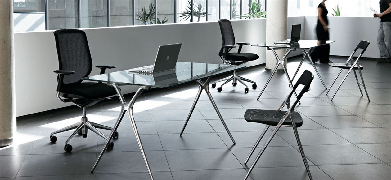 The Plek Glass desk comes with a fixed frame in a choice of polished, white, silver or black aluminium. The tops come in blue, clear or white 10mm glass in widths of 1400, 1600 & 1800mm – depth is 800mm.