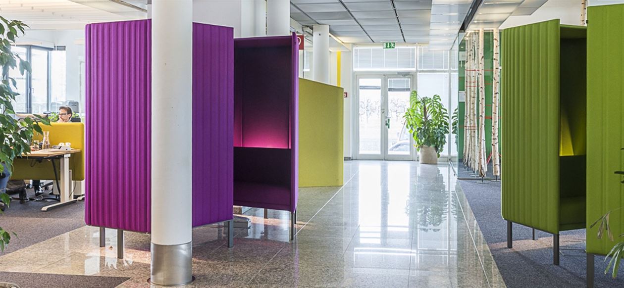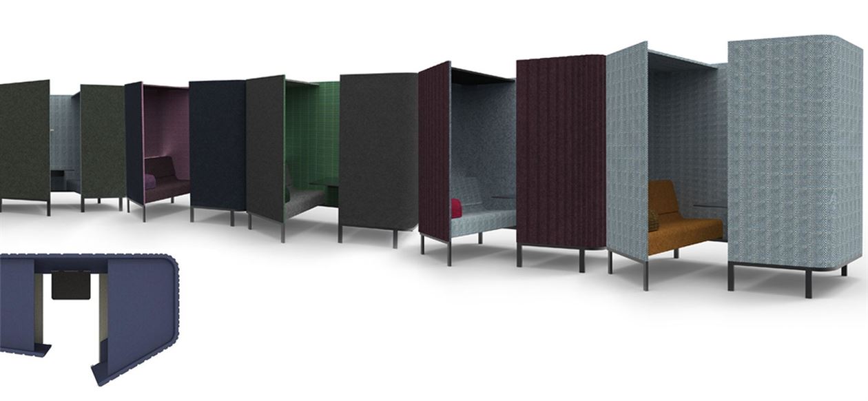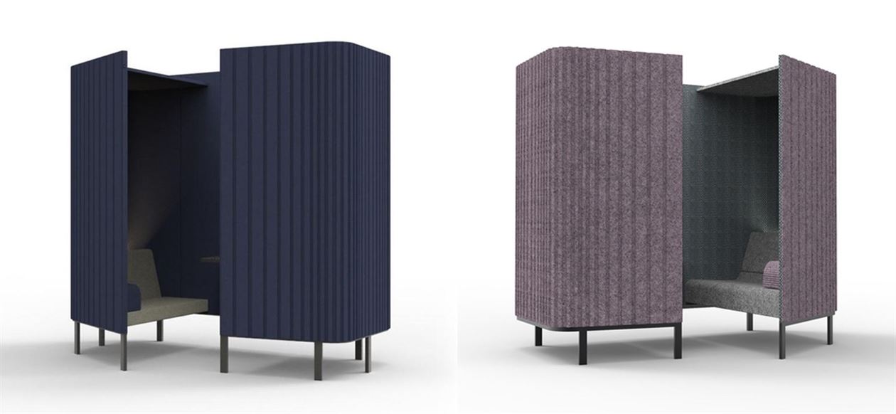 An acoustic cocoon (inspired by train compartments) that ensures a private, three-person meeting room without losing contact with the surroundings. BuzziHive can be used as a stand-alone element in any space. It can also be combined with other BuzziHives, creating a beehive effect.