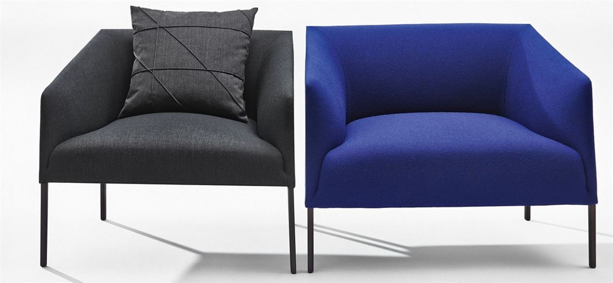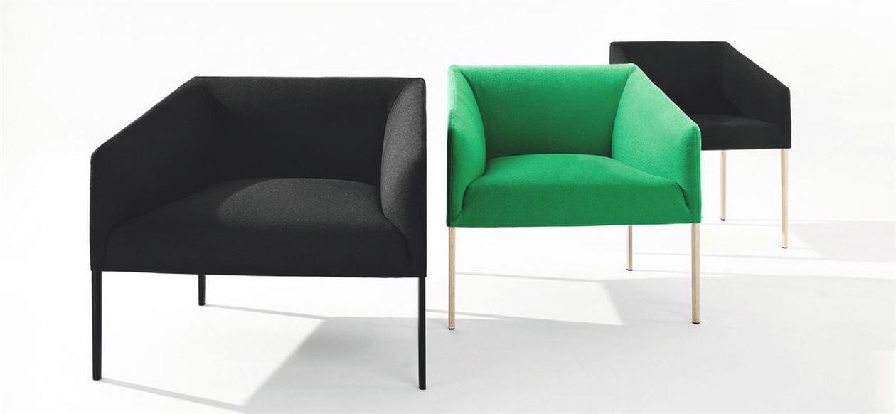 The Saari collection is a seating system of chairs, armchairs, sofas and benches designed for restaurants, bars, hotels and lobbies. A synthesis of classic and contemporary, its sculptural shape is enhanced by a wide range of colors and materials. Available as chair, armchair, bucket seat and a one-, two- and three-seat sofa and bench. A wood and metal frame upholstered in fabric or leather is mounted on a four-leg steel base which can be lacquered, chromed or veneered. The armchair and bucket chair versions are also available with trestle base, with or without castors.