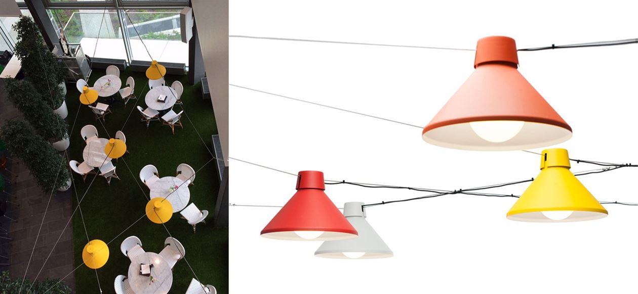 The Tokyo district of the same name inspired DAIKANYAMA; the pendant and cables create spatiality on a pleasant scale for both large and small areas. In zigzag, stricter or even slightly chaotic configurations between walls, ceilings and poles, with the electric cable running along the wire from one to the next. There are endless possibilities for this playful pendant with painted aluminium in standard colours: white, black, red, yellow and orange.Diameter 420 mm, height 300 mm.