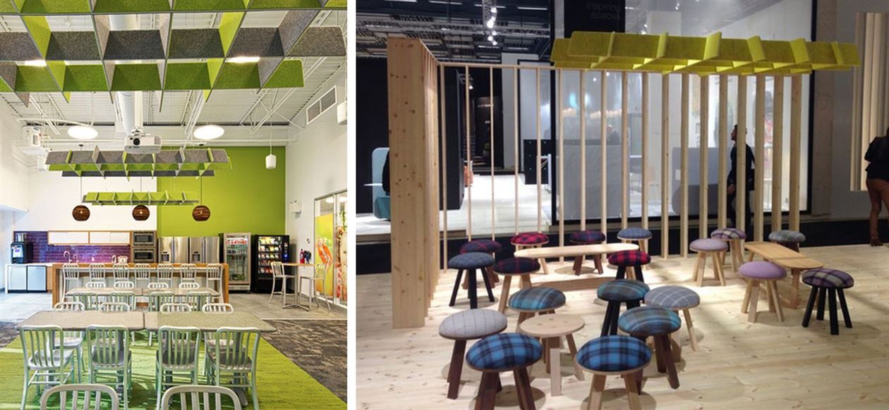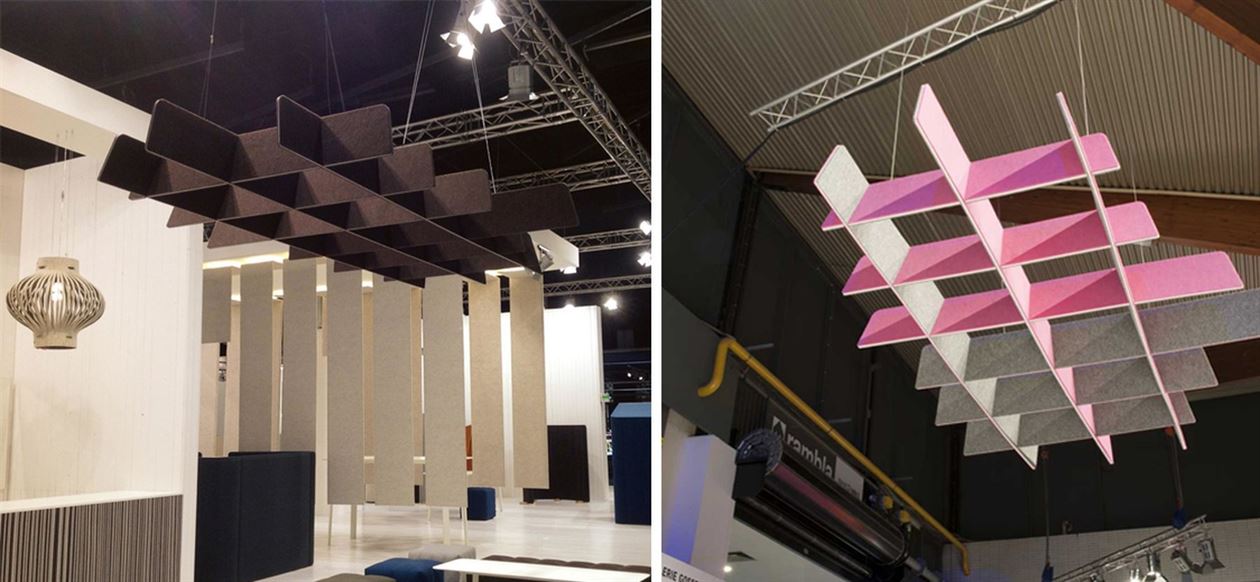 The BuzziGrid is a sound buffer that limits echo in a room. It takes its inspiration from the structures that have been widely used in the 60s and 70s to partially hide ceilings in public spaces. In this case the grid has been turned into a functional sound absorbing product that can be used in meeting rooms, lobbies, or other public spaces to define areas.