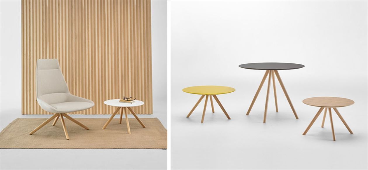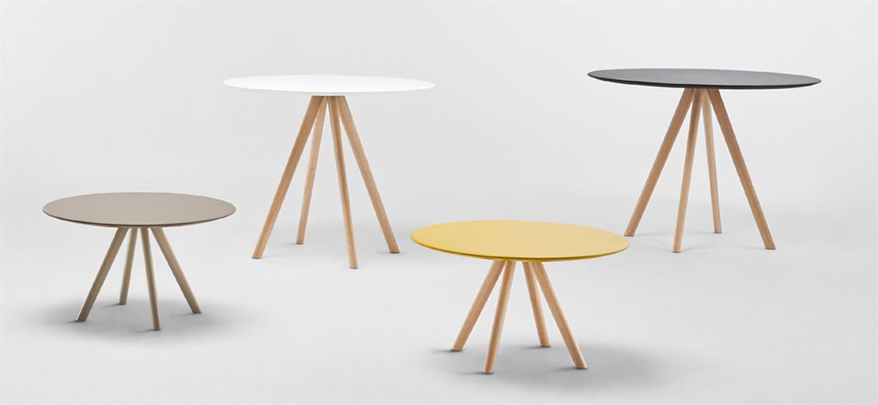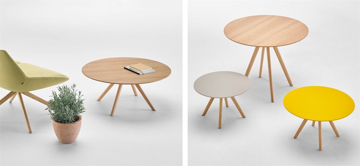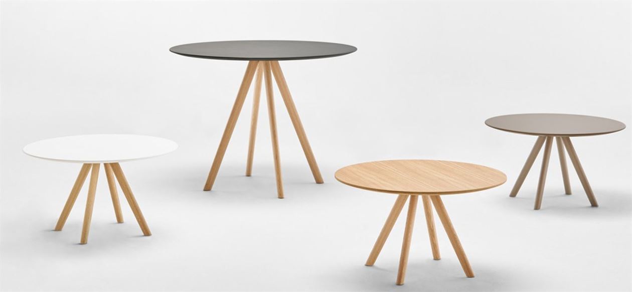 Designed by Christophe Pillet, the STIKS tables are given shape by combining an original central base of four wooden legs with table tops in different formats and materials. The base is produced in two heights and is made from natural oak wood. Their design allows them to be used in a variety of spaces and contexts.